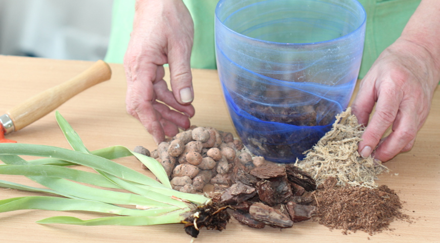 Для посадки орхидеи вам понадобятся керамзит, сухой сфагнум, измельченная сосновая кора. Можно также использовать кокосовое волокно. Контейнер лучше выбрать прозрачный - корни многих орхидей содержат хлорофилл и участвуют в фотосинтезе, поэтому лучше, когда они находятся на свету.