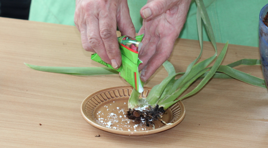Опудрите срезы корней порошковым стимулятором корнеобразования на основе индолилмасляной кислоты ("Корневин", "Укоренить").