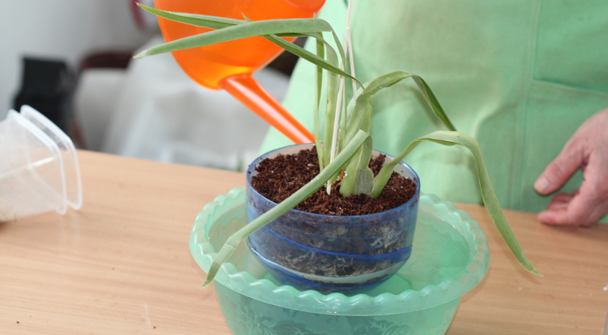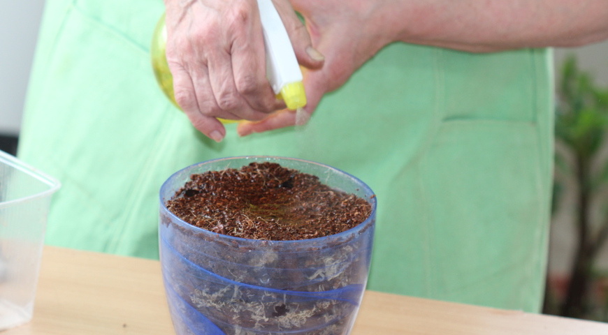 На полчаса установите контейнер в емкость с водой так, чтобы субстрат хорошо пропитался.