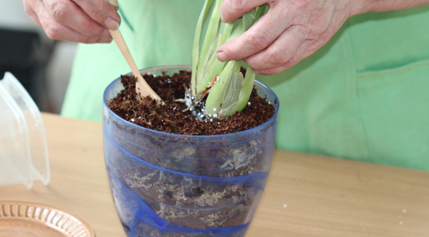 Установите на нем растение так, чтобы корневая шейка оставалась вровень с его поверхностью.