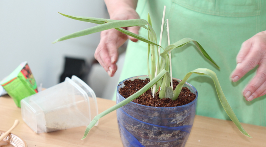 Для успешного укоренения пересаженной орхидеи важно сделать так, чтобы розетка была надежно закреплена и не раскачивалась. Установите по ее периметру спицы или деревянные шампуры для духовки, так чтобы они поддерживали растение со всех сторон.