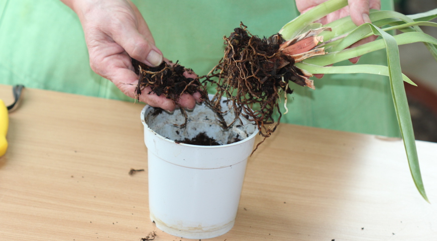 Выньте орхидею из горшка и освободите корни от старого закисшего субстрата.
