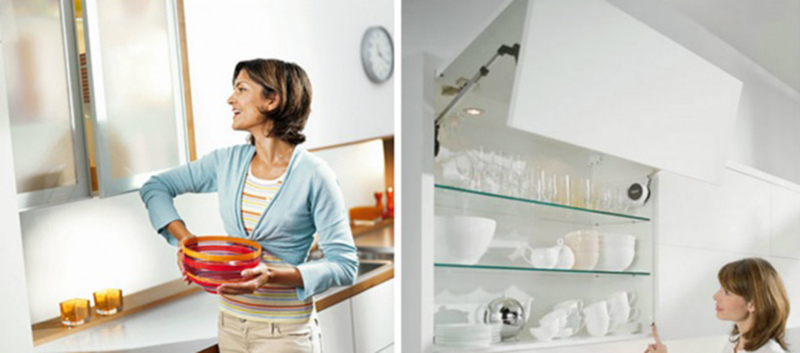 Сейчас стало модно заменять привычные ручки на мебели лаконичными углублениями, но мокрыми руками открывать их довольно сложно. Поэтому можно установить систему клик-клак. С ее помощью дверки можно открывать простым нажатием или даже локтем.