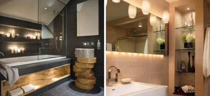 Чтобы сэкономить место, в ванной можно сделать полки-выступы. Плюс ко всему они еще и смотрятся очень стильно.