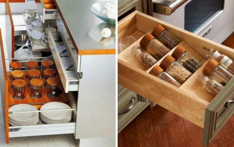Замени полки на своей кухне выдвижными ящиками — это не только сэкономит место, но и намного удобнее станет искать необходимую тебе кухонную утварь.