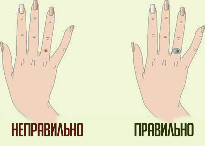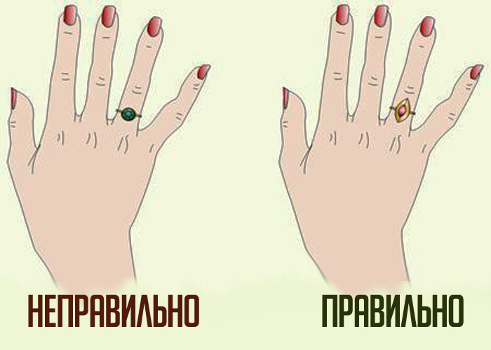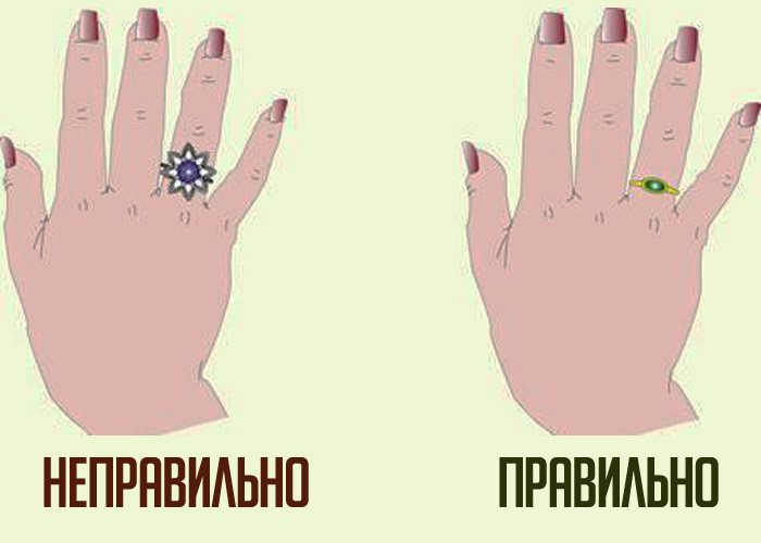 • Откажитесь от вредной привычки носить на одной руке кольца из разных металлов и с разноцветными камнями. Никуда не годится и вариант, когда вы носите одновременно явно дешевое и явно очень дорогое кольцо – хоть на одной руке, хоть на двух.