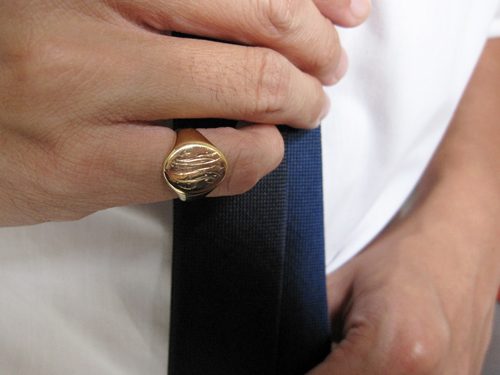 Чтобы избежать вычурности и выглядеть стильно, выбирайте гладкое обручальное кольцо полукруглой формы—такая форма актуальна во все времена. Кроме этого, мужчине допускается носить максимум еще только два кольца. Одно из них—фамильное гербовое кольцо или кольцо с печаткой. Кольцо с фамильным гербом носят, как правило, представители аристократии. А отличие печатки от гербового кольца состоит в том, что гравировка инициалов на ней производится зеркально. Эти кольца надевают на безымянный палец или мизинец левой руки. Они всегда производят аристократичное впечатление.