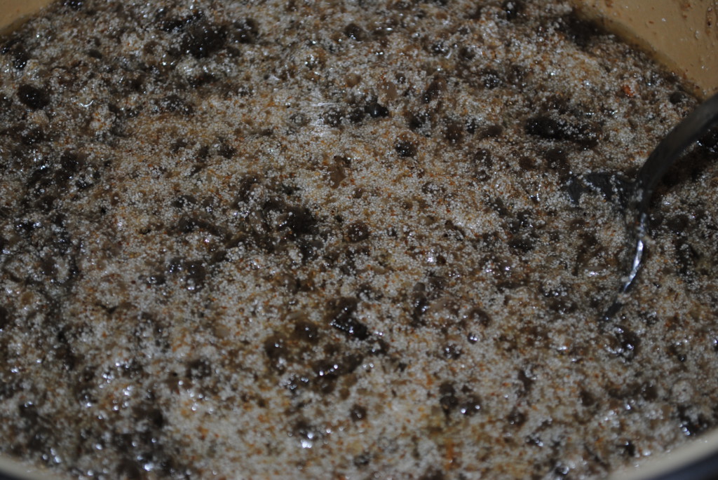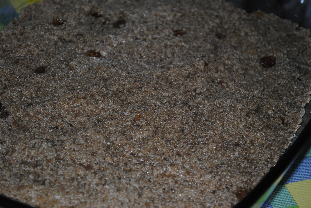 Поставить на огонь. Варить, пока сахар не растворится полностью. В смесь добавить манку и семечки. Перемешать до однородности. Всыпать изюм, и снова тщательно всё перемешать.