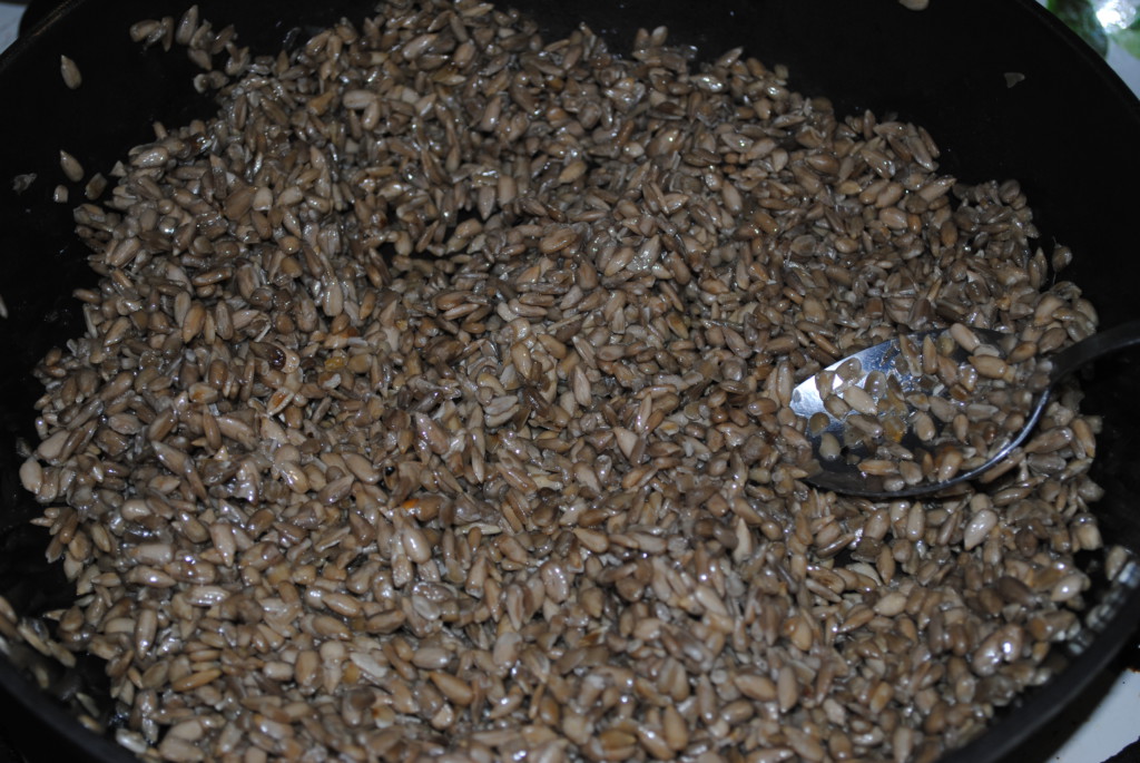 Семечки подсолнуха пожарить до золотистого цвета на сухой сковороде.