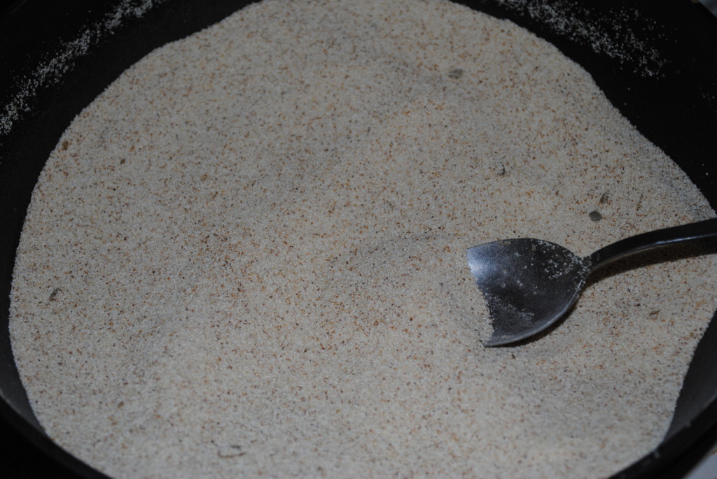 Манку поджарить на сковороде, помешивая, до золотистого цвета.