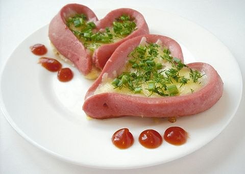 Ветчину порезать. Выложить на противень вместе с фасолью.