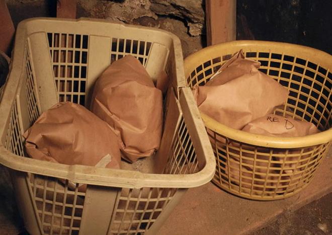 Некоторые огородники предпочитают хранить капусту в глине. Тщательно смешивают 2 части глины и 1 часть воды, полученной массой смазывают каждый кочан, после чего просушивают их и укладывают на полки в погребе или подвале.