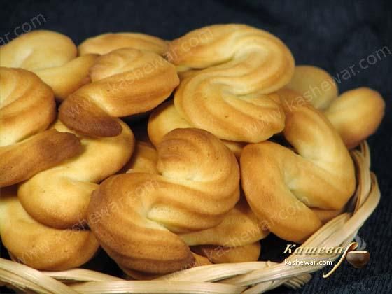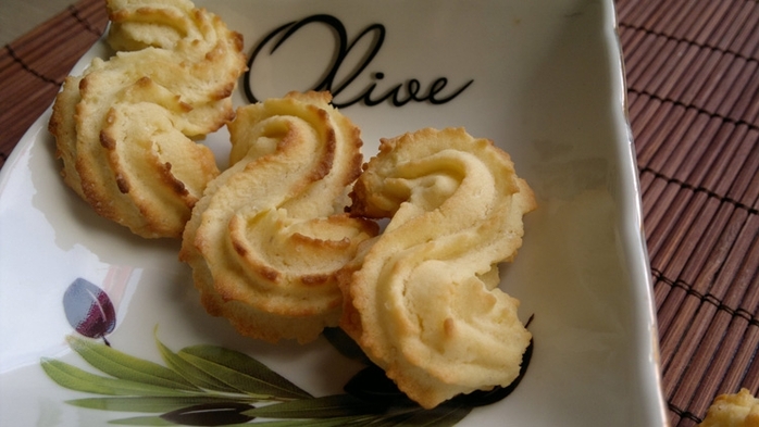 Затем, кладем тесто частями в кондитерский мешок с насадкой-звездочкой и выдавливаем печенье на противень, застеленный бумагой для выпечки, пытаясь изобразить прописную букву «г».