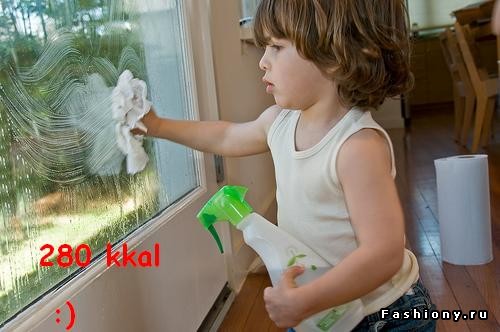 Подметание полов - 20 калорий за минуту ! Вытирание пыли -80 калории за час ! Подметание полов - 20 калорий за минуту ! Чистка ковров пылесосом - 250 калорий за час. Мытье посуды - 4 калории за минуту !