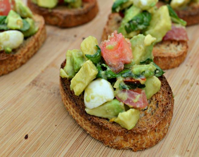 Вам понадобятся: 2 авокадо, 2 помидора, 1 лимон, 1 ч.л. соли, 1/2 луковицы, 3 ст.л. свежей нарезанной кинзы (или петрушки), 1 зубчик чеснока, 1 французский багет, оливковое (или растительное) масло.