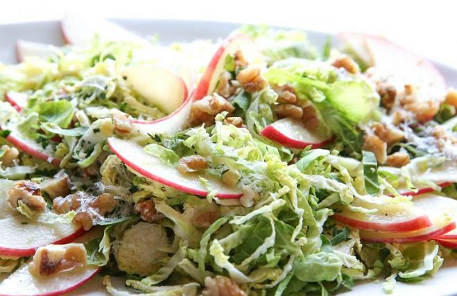 Вам понадобятся: 1 кг брюссельской капусты, 1 яблоко, 100 г грецких орехов, 50 г твердого сыра, 2 ст.л. красного винного уксуса, оливковое масло, 1 ч.л. меда, полпучка петрушки, соль, молотый черный перец.
