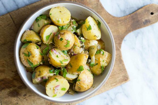 Картофельный салат готовят на Новый год во многих странах Европы. Но в каждой стране он имеет свои особенности. В этом рецепте, например, следует заправлять салат особой заправкой – винегретом.