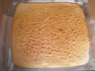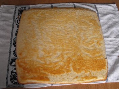 Выложить тесто на противень, разровнять и выпекать около ~ 15 мин (зависит от вашей духовки. Если передержать, рулет может поломаться, т.к. пересушится. У некоторых девочек бисквит готовится за 6 мин. Экспериментируйте). Готовый бисквит будет иметь золотистую поверхность.