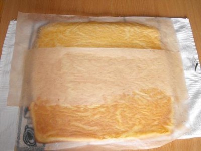 Разрезаю на два прямоугольника. Готовлю начинку. Промазываю один корж, сверху кладу другой.