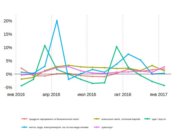Более разительным изменение тарифов получается, если смотреть динамику не месяц к месяцу, а за год. 2016-й стал годом динамичного повышения тарифов. В частности, тарифы на электроэнергию возросли на 60%, газ — на 42%, отопление — на 88,4%.
