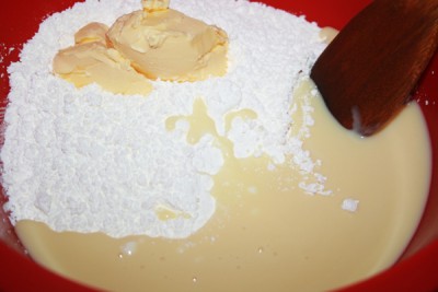 В чашку всыпать крахмал,положить маргарин и влить сгущенку