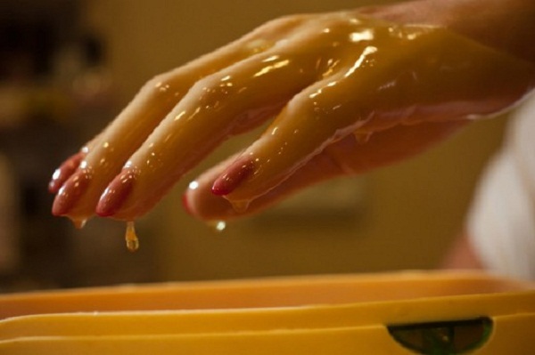 Жидкий парафин наливаем в сосуд с высокими бортами и погружаем туда кисти рук. Обязательно проверьте, чтобы парафин не был слишком горячим.