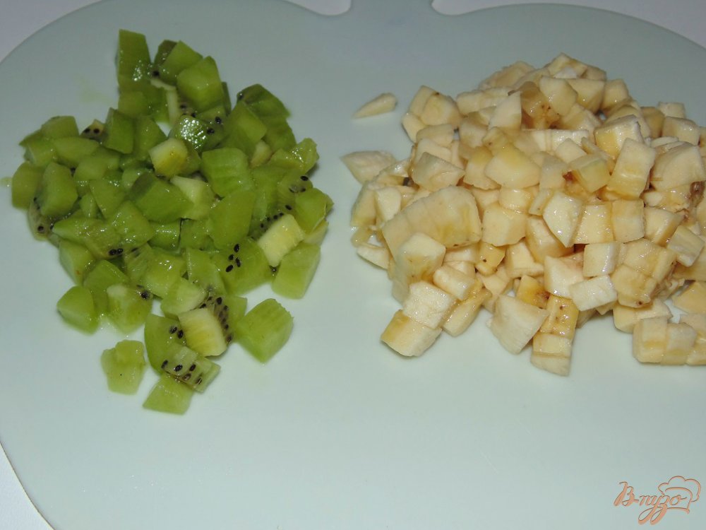 Очистить киви и банан от кожуры, нарезать мелкими кубиками.