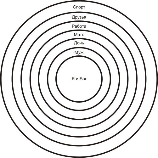 1-ый круг, центральный- в нем только Ты и Бог. Ты — потому, что вся эта жизнь — твоя, ты — самый главный актер в пьесе твоей жизни, которая написана совместно с Богом. В данном контексте прошу не напрягаться атеистов. Поместите вместо «Бог» в первый круг «Совесть», «Реальность», то, что как Вы считаете руководит всем в этом мире. Бог должен присутствовать как опора и безоценочно любящий и принимающий — Родительская фигура.