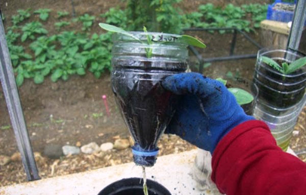 Оригинально можно применить бутылку, разрезав ее пополам. Для этого лучше взять 2-литровую. В «воронку» — часть бутылки с крышкой — насыпают грунт и помещают туда пророщенные семена, а в «стакан» наливают воду и устанавливают туда воронку. Уровень налитой воды должен доставать до горлышка; пробку, конечно, снимают. Вы получаете систему индивидуального автополива для каждого собственноручно изготовленного горшка. Это удобно, красиво и компактно.