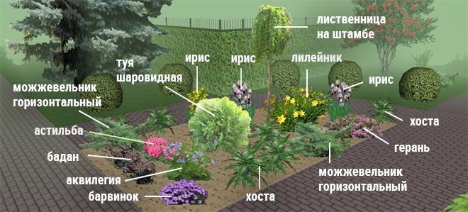 Причем необходимо правильно скомпоновать растения по высоте. Зная, что хосты, баданы и герани вырастают до 30-40 см, их высаживают на переднем плане. Ближе к середине цветника размещают более высокорослые растения: тую шаровидную, лиственницу на штамбе, ирисы, лилейники, аквилегию.