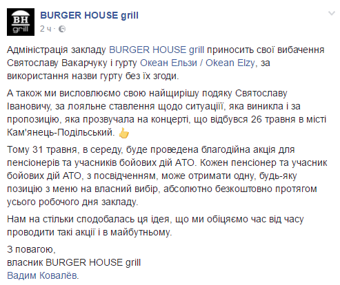 "Мы же решили, прямо на концерте посоветовавшись со зрителями, жителями города, разрешить использование этому заведению нашего имени на этой, конкретной рекламе при условии, что они будут целый день кормить бесплатно пенсионеров и участников АТО. Все несколько тысяч зрителей это поддержали", — рассказали музыканты.