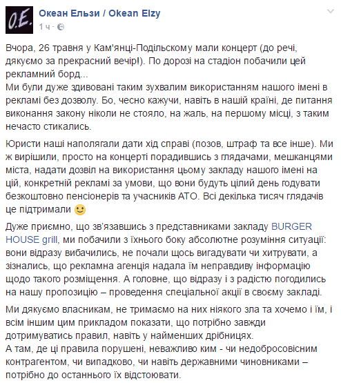 Недавно (26 мая) "Океан Эльзы" сыграли сольный концерт в Каменце-Подольском. Одно из местных заведений питания решило сделать себе рекламу на этом концерте. Однако за это пришлось расплатиться довольно необычно. Саму историю инцидента у себя на странице Facebook выложила группа.