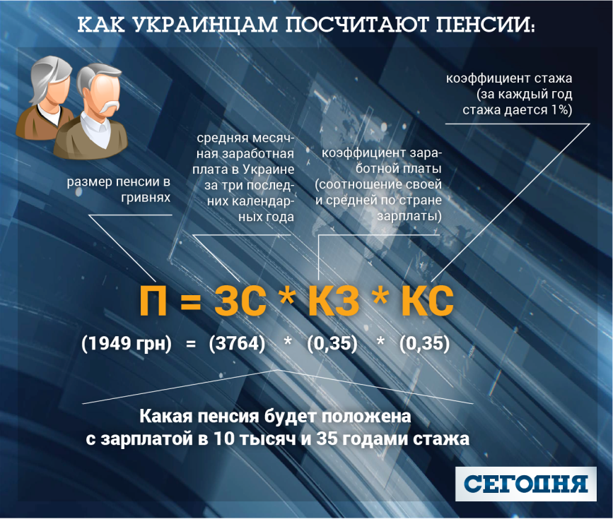 Размер пенсии украинцев зависит от трех показателей: собственной зарплаты, стажа и средней зарплаты по стране за три года. Сейчас пенсии считают по формуле: средняя зарплата за три года по стране * собственная зарплата/средняя зарплата по стране * стаж *1,35%. В рамках реформы правительство предлагает вместо 1,35% за каждый год стажа давать 1%.