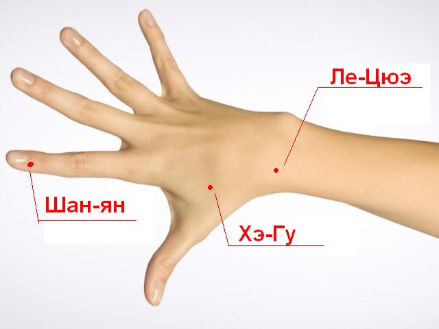 - Точка Ле Цюэ рассматривается вместе с точкой Хэ-Гу,как места средоточия очень многих болезней. Точку Ле Цюэ можно найти при скрещивании кистей через большие пальцы.Указательный палец при таком положении ляжет как раз на эту точку.Точка Ле Цюэ также,как и Хэ-Гу-универсальная и массируется во многих случаях,в том числе и от зубной боли. В одной из древних книг 1329 года издания про эти две точки говорится,что их можно использовать при лечении «… всех болезней головы, лица, ушей, глаз, носа, щек, рта и зубов».