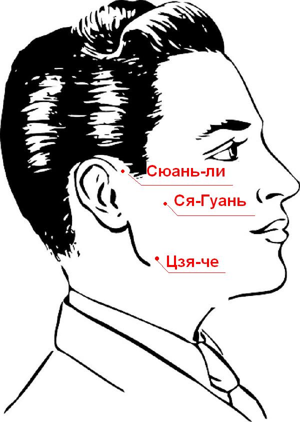 - Точка Ся-гуань располагается под нижним краем дуги скулы, на уровне шейки нижней челюсти, в небольшом углублении и массируется для зубов верхней челюсти.