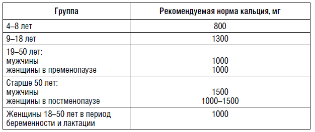 Таблица 1 — Рекомендуемые нормы потребления кальция у лиц различного пола и возраста.