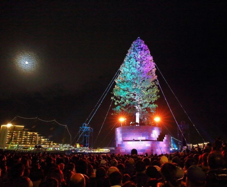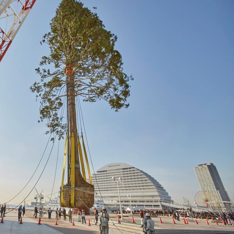 Любопытно, что кураторы проекта выбрали в качестве главного рождественского дерева не ель, а туевик, произрастающий на японских островах. 150-летнее дерево было найдено Нисихатой 4 года назад в лесу японского города Хими. Его вес составил 24 тонны, высота – 30 метров.