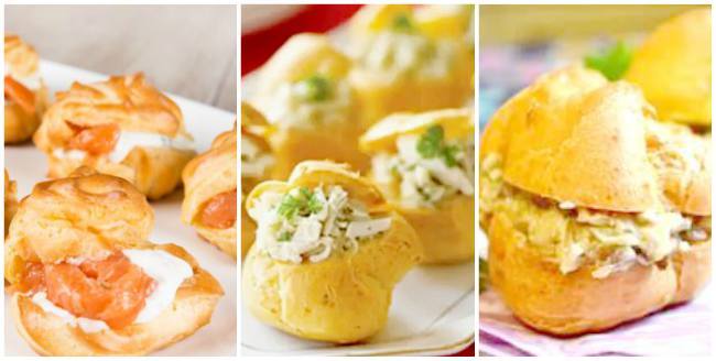 Для необычных профитролей приготовьте вкусный форшмак. Слабосоленую среднюю сельдь, очищенное яблоко, одно сваренное вкрутую яйцо перемалывают в блендере. Альтернативное наполнение создается из взбитых сливок (120 мл, 30% жирности), измельченного базилика.