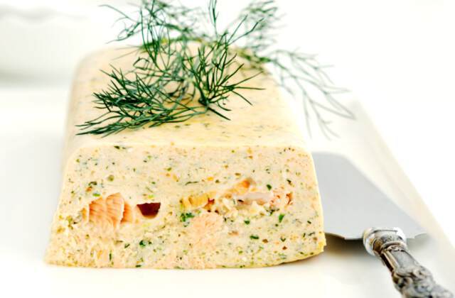 Сверху заливается остальная начинка, закрывается филе, потом пленкой. Форма стоит в холодильнике под грузом не меньше 12 часов. Террин перед подачей нарезается на порционные кусочки.