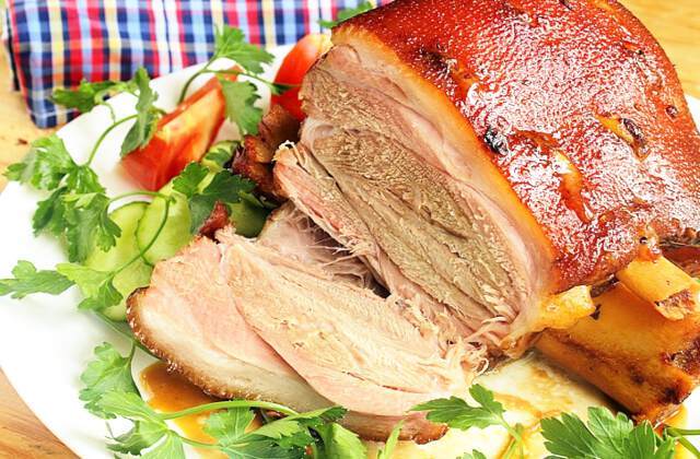 Далее запекать мясо в духовке (220 градусов). Готовится смесь из 30-40 г меда и соевого соуса. Она намазывается на рульку каждые 5 мин, пока не закончится. Подают к столу с горчицей в зернах, зеленью, хреном.