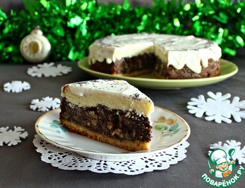 Приготовленный крем распределяем по поверхности остывшего пирога и разравниваем ложкой. Пирог посыпаем сухим маком, но можно декорировать любой посыпкой.