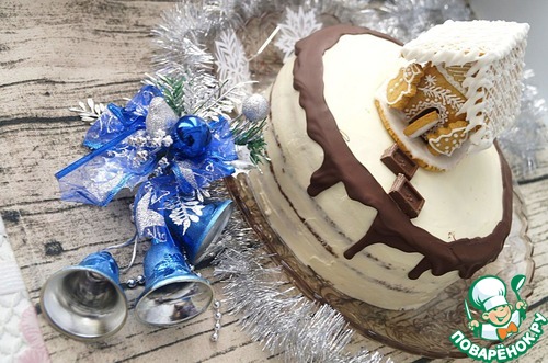 Украсить торт на свой вкус. Можно использовать растопленный шоколад и заранее приготовленный пряничный домик.
