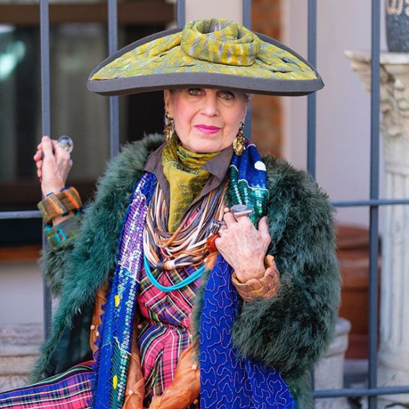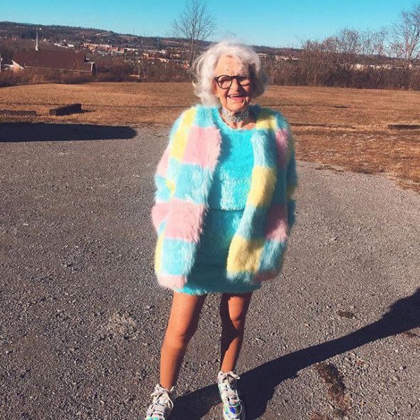 Лили Хейс из США примеряет смелые молодежные образы. В своих постах он часто шутит над собой. Женщина пародирует дизайнера Карла Лагерфельда, музыканта Элвиса Пресли и Лучано Паваротти. В ее модном арсенале всегда присутствуют большие тонированные очки, кепки, забавные костюмы, леггинсы с ярким принтом, кофты из плюша.
