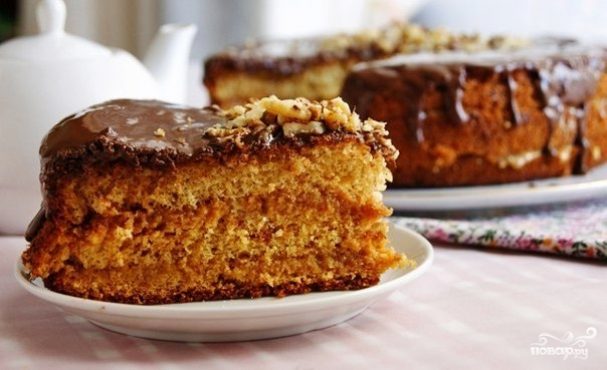 Сверху смазываем сгущенкой (или топленым шоколадом), посыпаем рублеными орешками. Готово!