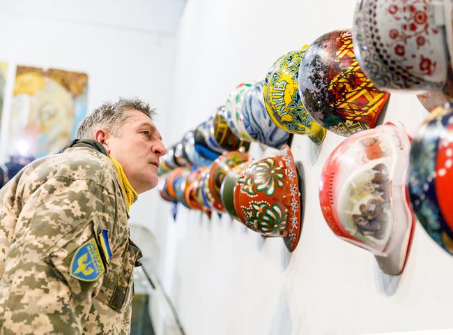 Центральное место коллекции занимают рисованные каски: разноплановые по стилю и технике исполнения. Кстати, Юрий с псевдо «Пикассо», боец «Самообороны» основал это творческое движение, а затем идею подхватили и продолжили профессиональные художники, студенты. Во время Революции Достоинства творчество и искусство шли рядом с реальной борьбой на баррикадах, поэтому и выставка показывает эту крепкую связь: изысканно расписанные каски расположены рядом со щитами, оберегавшими майдановцев во время противостояний. Особое внимание посетителей привлекают большие шахматы, а фигуры символично соответствуют сторонам противостояний: белые — Майдан, черные — силы тогдашнего президента Януковича.