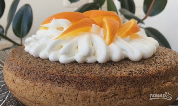 Половину апельсина нарежьте тонкими ломтиками и выложите их на крем. Всё, пирог готов, приятного аппетита!
