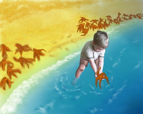 Человек шел по берегу и вдруг увидел мальчика, который поднимал что-то с песка и бросал в море. Человек подошел ближе и увидел, что мальчик поднимает с песка морские звезды. Они окружали его со всех сторон. Казалось, на песке — миллионы морских звезд, берег был буквально усеян ими на много километров.
