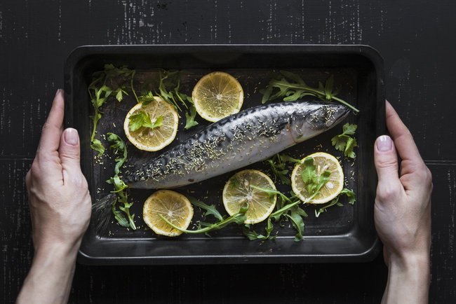 Рыбу выпотрошить и почистить. Разогреть духовку до 200 С. Большую прямоугольную форму или противень выстелить фольгой.