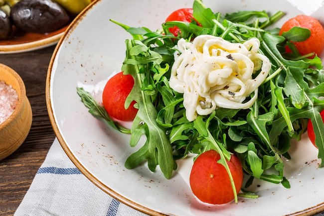 Перемешать салат, поперчить и заправить его оливковым маслом, смешанным с лимонным соком.