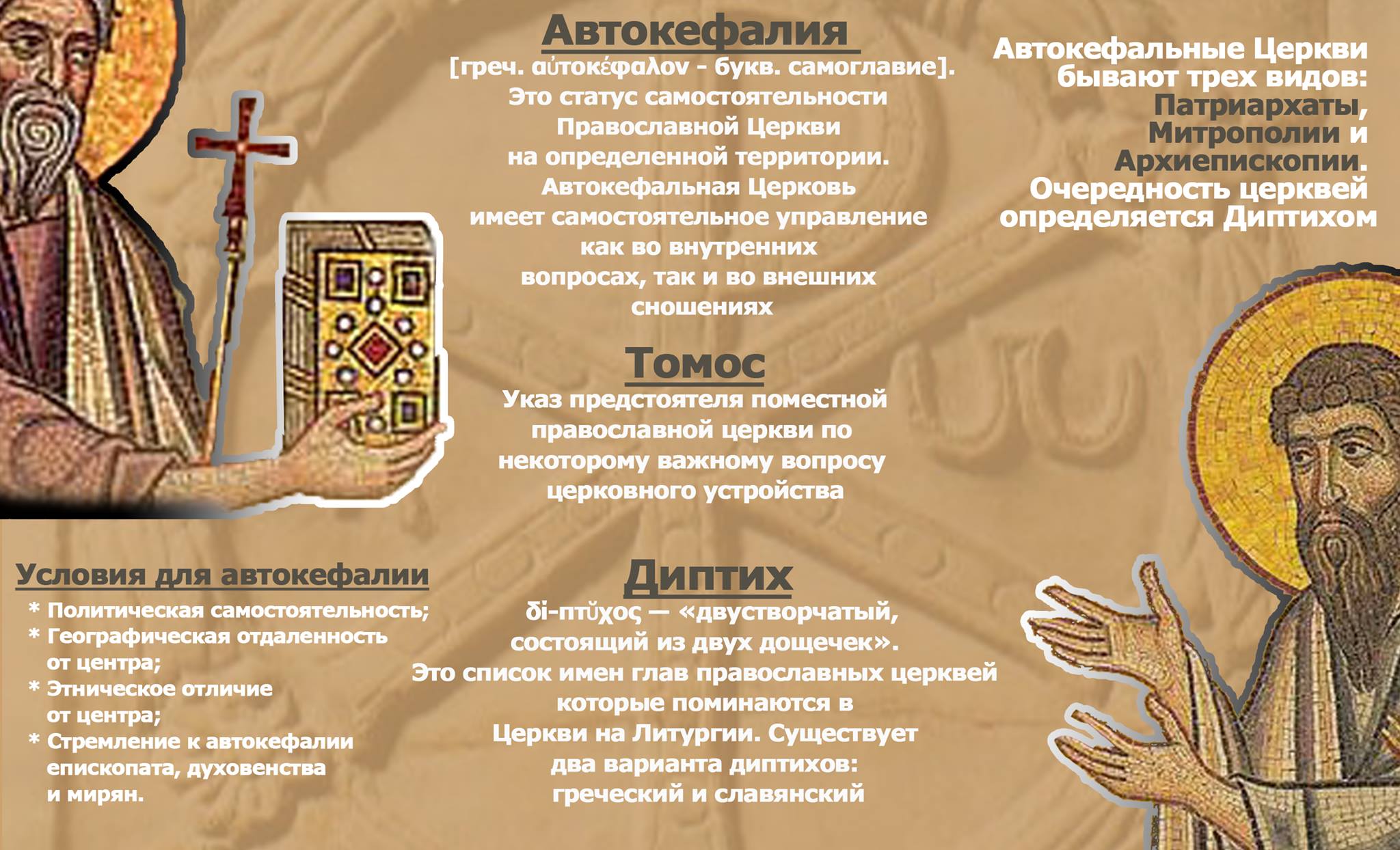 Стоит отметить, что автокефальные церкви бывают трех видов: Патриархаты, Митрополии и Архиепископии. Очередность церквей определяется Диптихом.